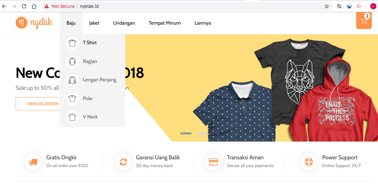 Buka nyetak.id, dan pilih jenis barang yang ingin ada custom, sebagai contoh, pilih "T Shirt Dewasa"