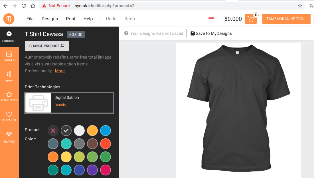Anda akan melihat tampilan seperti di bawah ini dan anda bisa dengan mudah melakukan kustomisasi untuk menambahkan kata-kata, merubah warna baju, photo, template, cliparts & shapes.