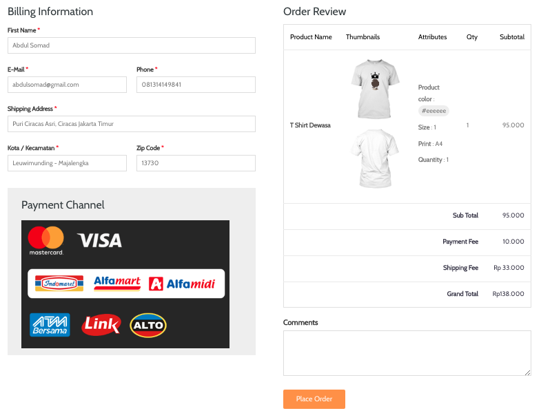 Di halaman Checkout, anda diharuskan mengisi identitas pribadi anda seperti shipping information, email address dan lain-lain nya, disini juga akan dihitung biaya shipping sesuai kecamatan tempat barang anda akan dikirimkan, setelah mengisi seluruh form, klik tombol "Place Order" untuk melanjutkan kehalaman pembayaran, anda akan di redirect ke halaman DOKU.com sebagai system pengelola pembayaran.